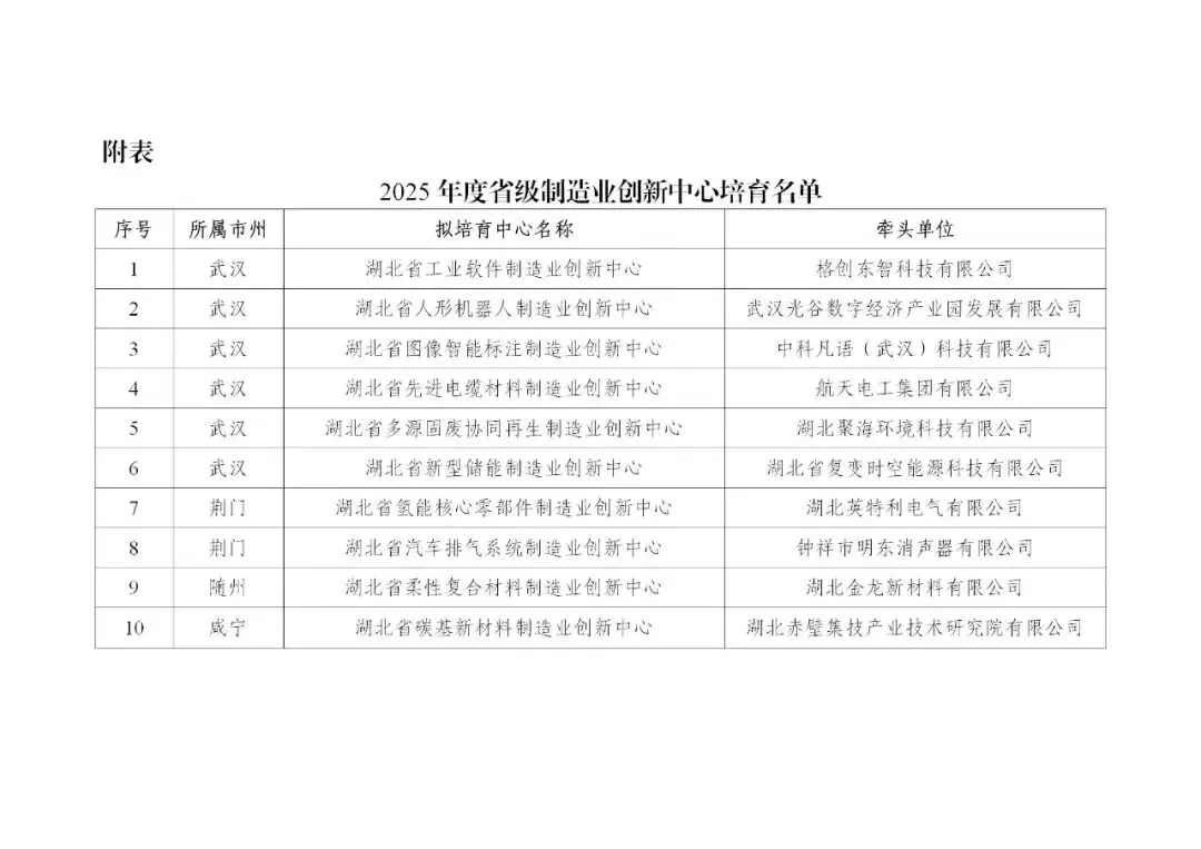 湖北省经信厅关于公布2025年度省级制造业创新中心培育名单的通知