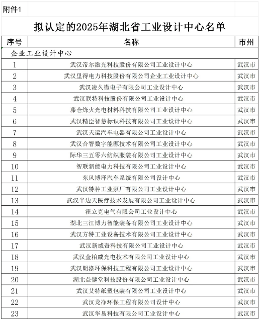 根据《省经信厅办公室关于做好2025年度省级工业设计中心申报工作的通知》,现将拟认定的2025年度省级工业设计中心名单予以公示。请社会各界监督,如有异议,请在公示期内将意见书面反馈至湖北省经济和信息化厅(产业政策处)。