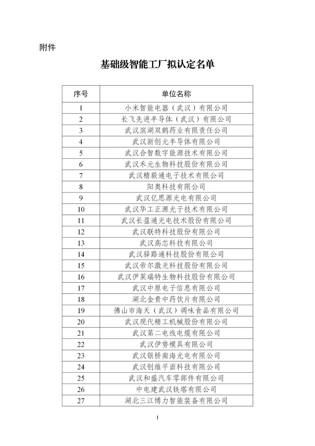 按照《省经信厅办公室关于开展2026年度智能工厂梯度培育的通知》文件要求,我局组织开展了2026年度基础级智能工厂的申报工作。经企业自主申报、各区推荐及市级复核,拟认定小米智能电器(武汉)有限公司等57家单位为基础级智能工厂,现予以公示。