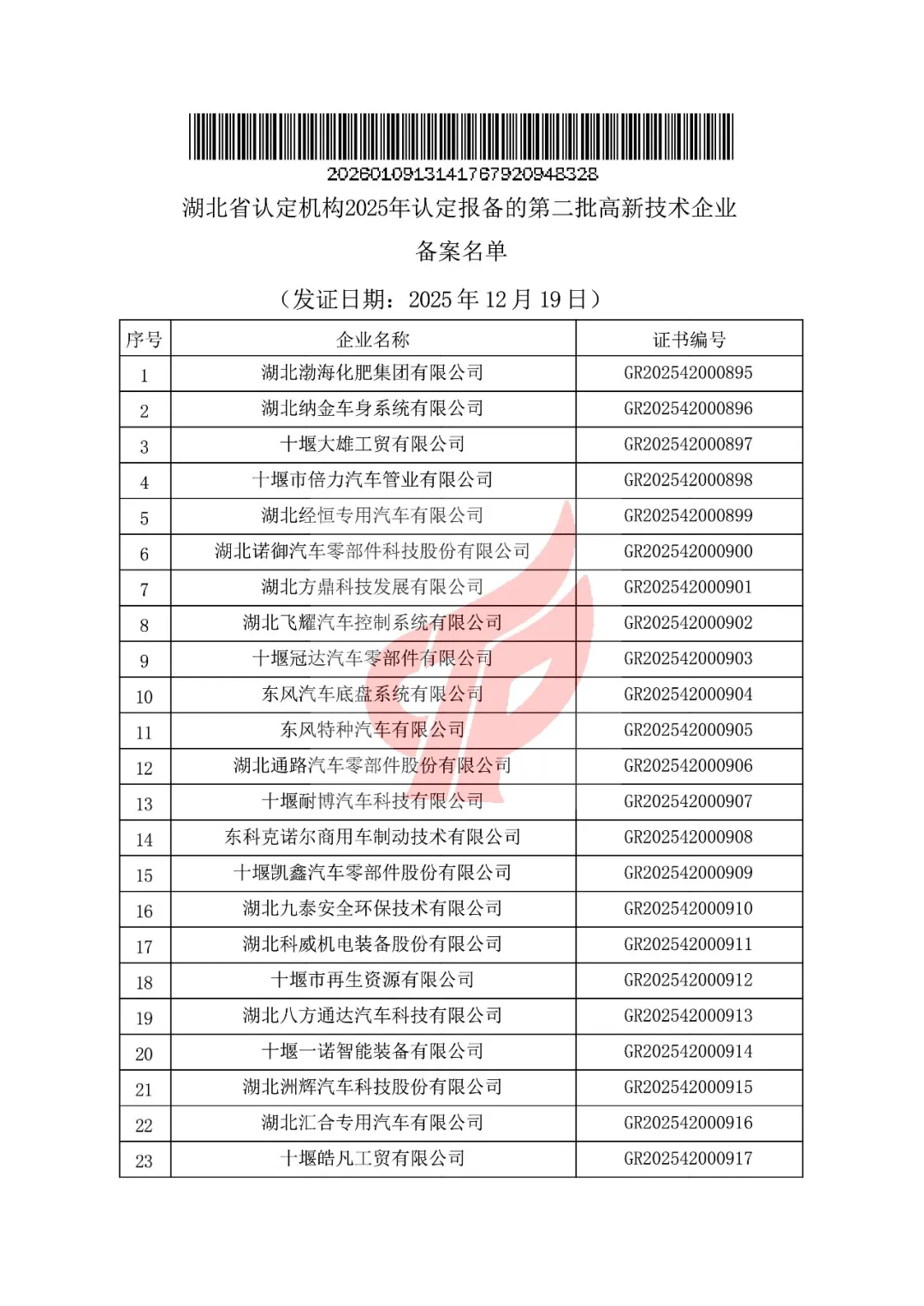 对湖北省认定机构2025年认定报备的第二批高新技术企业进行备案的公告