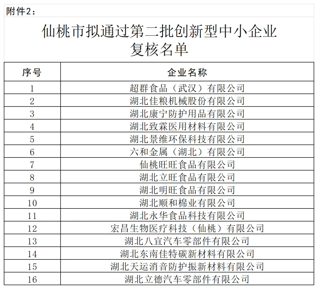 2.仙桃市拟通过第二批创新型中小企业复核名单